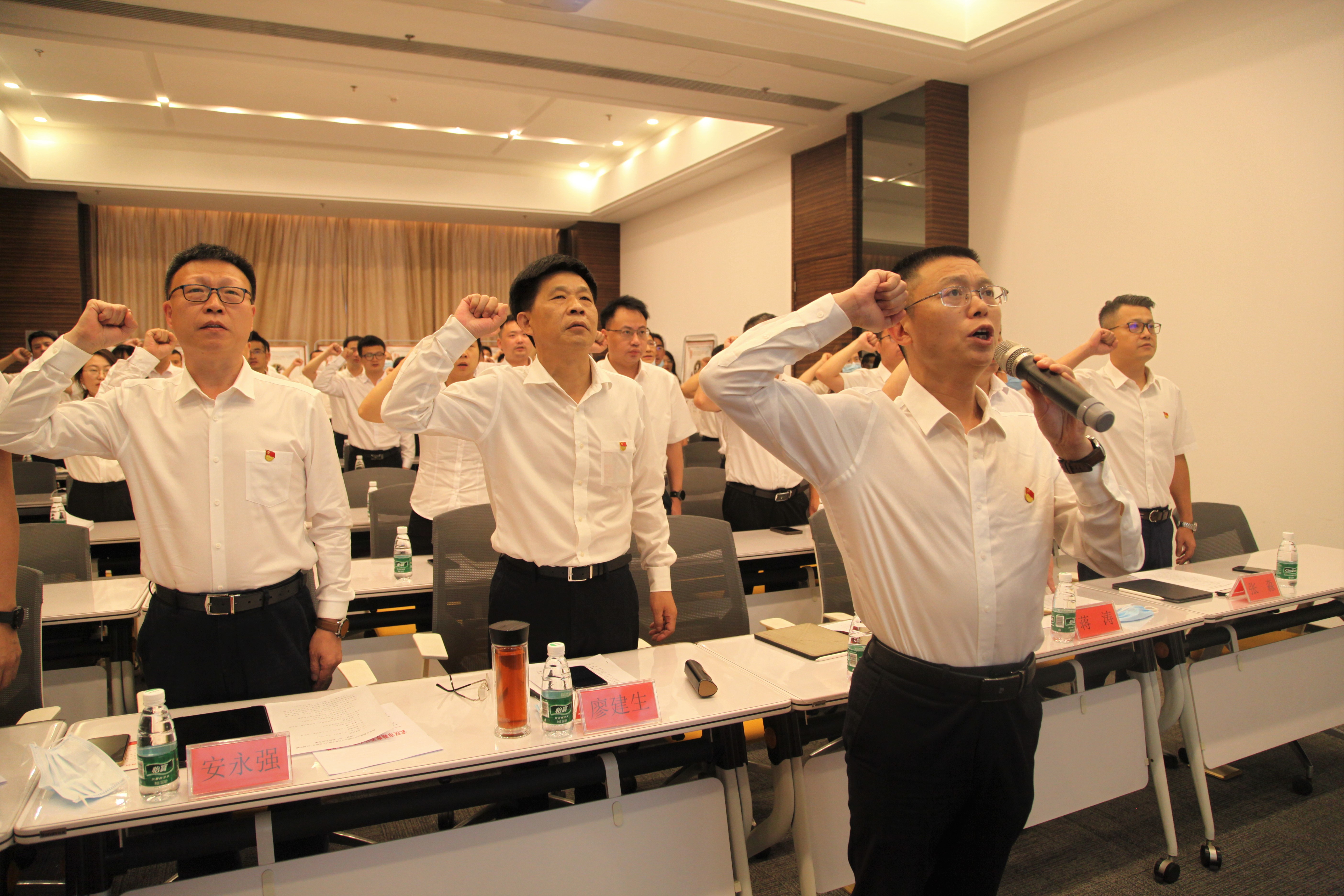 公司黨總支委員、總經(jīng)理施木俊帶領(lǐng)全體黨員,面向黨旗、緊握右拳,重溫入黨誓詞。