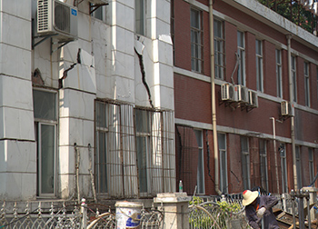 事故現(xiàn)場位于省人民醫(yī)院附近,張之洞路從解放路路口至復(fù)興路路口一段。事發(fā)工地上,大型吊車正開展設(shè)備清理吊運(yùn)工作,事故地段道路已設(shè)置施工圍欄,只留下不到兩米寬的安全通道。盡管險情已初步得到控制,但事故區(qū)域邊緣樓房側(cè)壁大面積范圍內(nèi)出現(xiàn)裂縫,墻體輕微坍塌,有進(jìn)一步下陷趨勢。