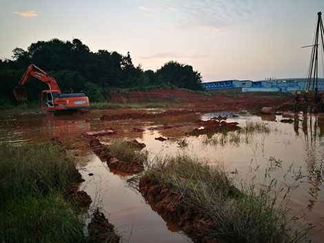 自設(shè)備進場,9月下旬至10月上旬,咸寧市又遭遇了連續(xù)降雨天氣,場地濕滑,地表滿布淤泥,施工條件極差,進駐現(xiàn)場后,現(xiàn)場負責人及時調(diào)配三組水泵、挖機等場地整理設(shè)備,對現(xiàn)場的泥水,淤泥進行全面的清理整平工作,以保證鉆探施工正常作業(yè)。但連續(xù)陰雨天氣的影響,導致場地不斷積存大量泥水,而武漢市勘察設(shè)計有限公司承擔的咸寧高新區(qū)(甘魯片區(qū))棚改項目施工勘察項目的外業(yè)鉆探還在堅持作業(yè)。項目現(xiàn)場負責人同鉆機班組一道攻堅克難、櫛風沐雨,在泥水中作業(yè),雨鞋、衣服滿是泥漬。