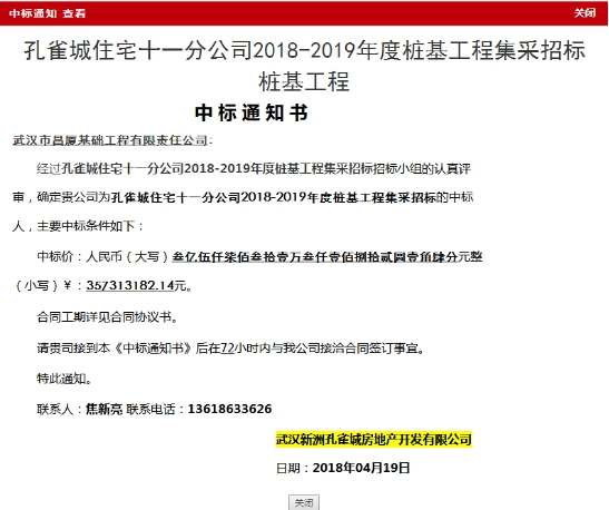2018年4月19日,我司經(jīng)過多輪競爭報價,成功中標(biāo)孔雀城住宅十一分公司2018-2019年度樁基工程集采招標(biāo)樁基工程,中標(biāo)價為3.57億元。 與武漢新洲孔雀城房地產(chǎn)開發(fā)有限公司合作,是我公司繼保利地產(chǎn)(集團)股份有限公司、萬科房地產(chǎn)(集團)股份有限公司、金地...